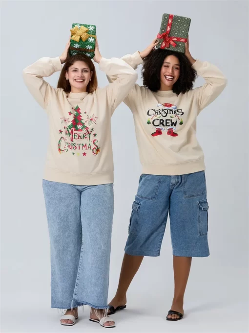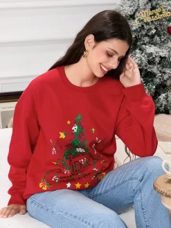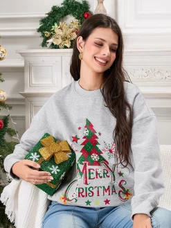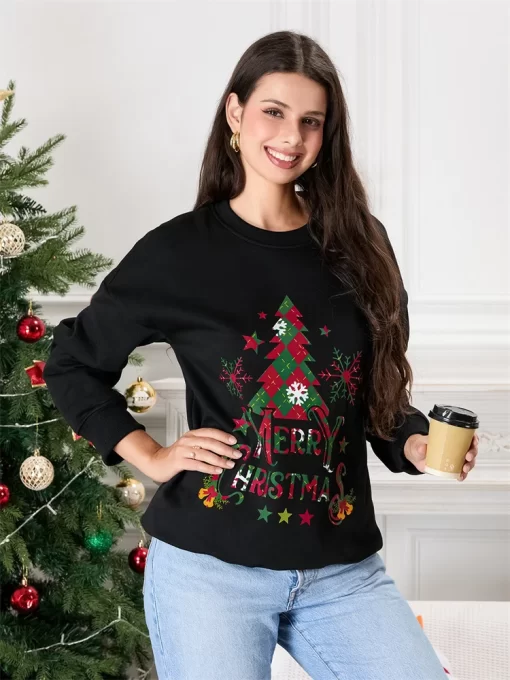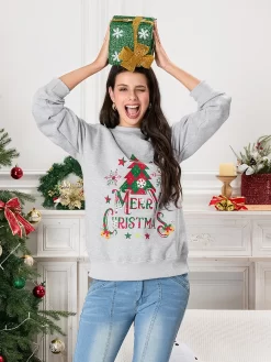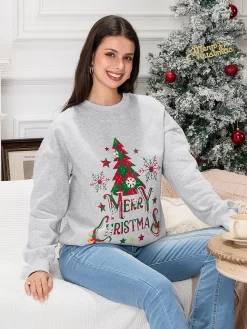 Christmas tree letter print design adds a touch of joy; Long sleeves, round neck; Long sleeve sweatshirt for women; Workout sweatshirt for women; Loose fit, stylish and comfortable, ideal for adding to your closet